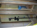 More insulation. Outlet at the lower left for... whatever. Switch for outside light and a three-way switch for the overhead lights. Single outlet circuit, probably for the microwave.